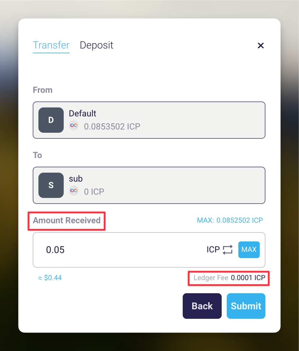 The MAX button fills in the maximal amount that can be entered, which is equal to the balance in the spending subaccount minus the ledger fee.